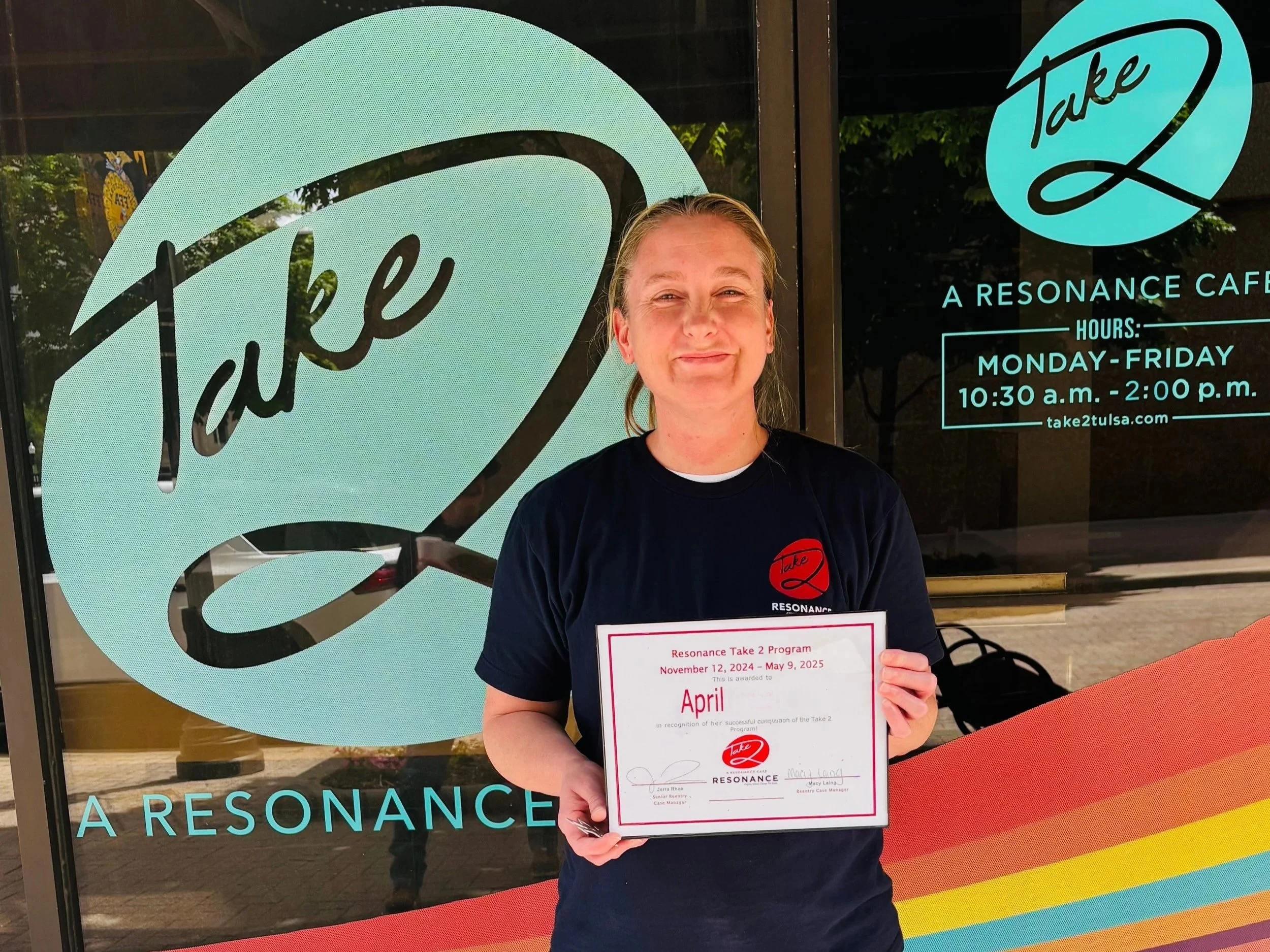 Congratulations to April, who graduates today from the Take 2 Café program! She shared, “Working at Take 2 has been a blessing for me. I never thought I would be where I am today and have the support system I have. I’ve been able to build healthy relationships with not only everyone here but everyone in my life.”