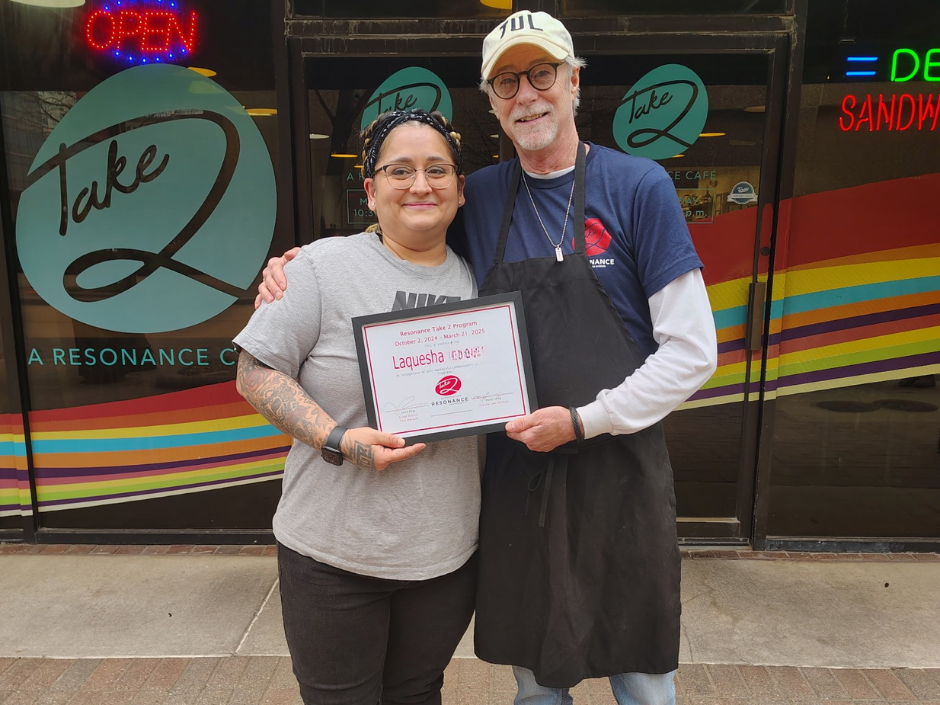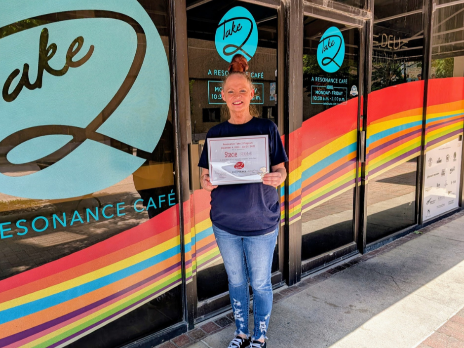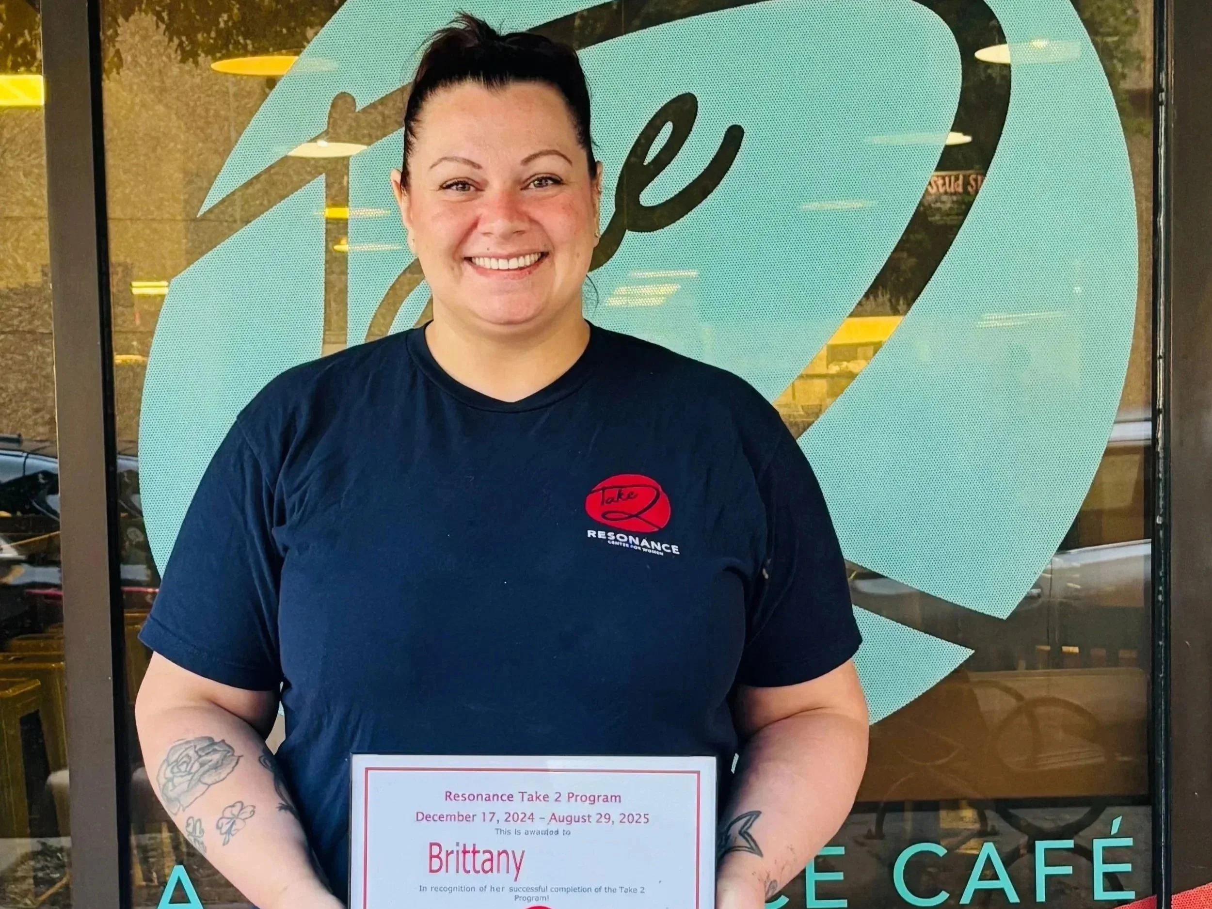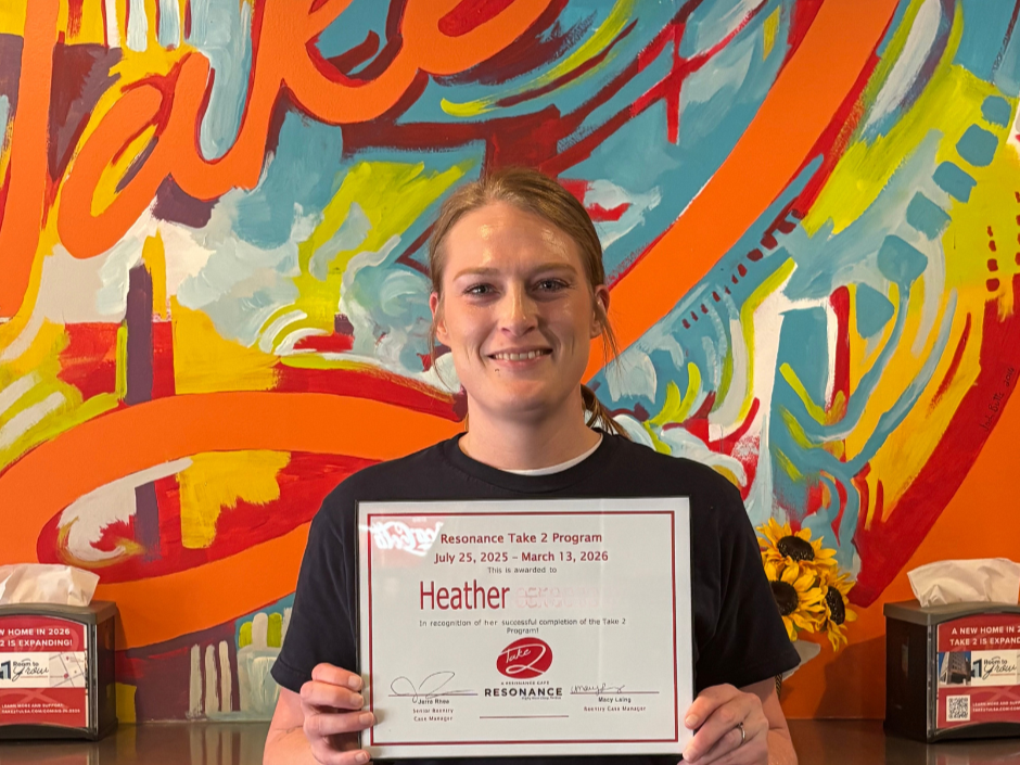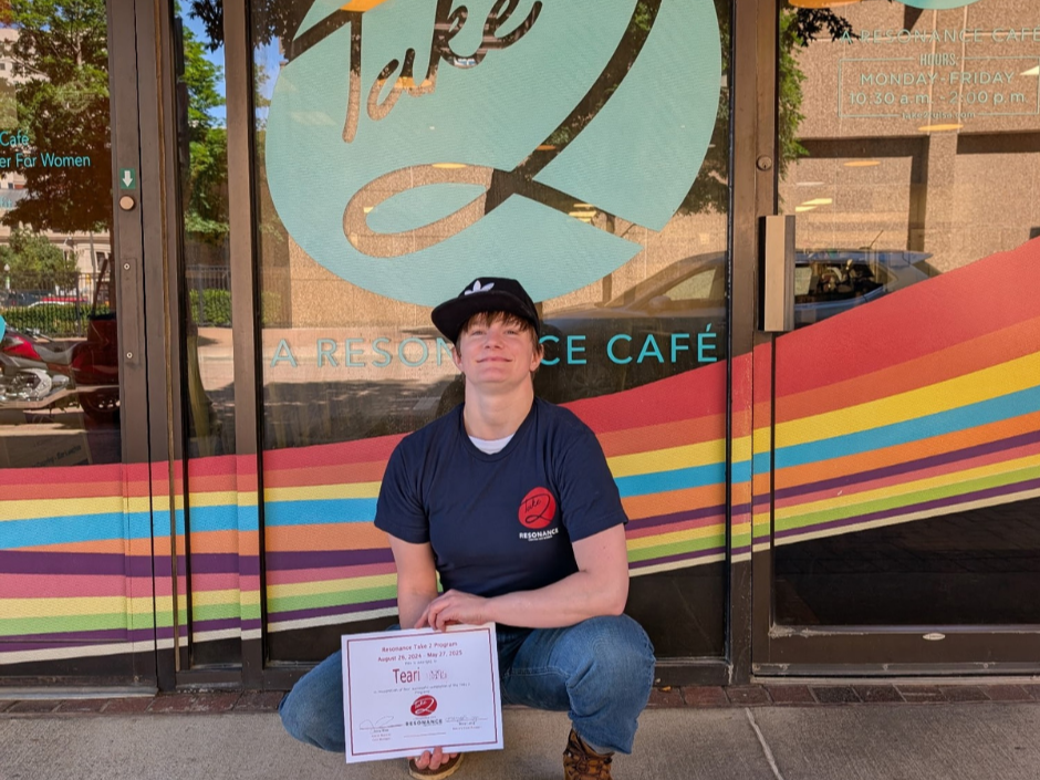 Help Resonance Center for Women celebrate Brittany, our most recent Take 2 Cafe graduate! The program helped her overcome social anxiety and learn to work in a fast paced, busy environment. She says, “I have made changes in myself mentally, physically, and emotionally…and I couldn’t have done it without the stability and confidence that this program has given me.”